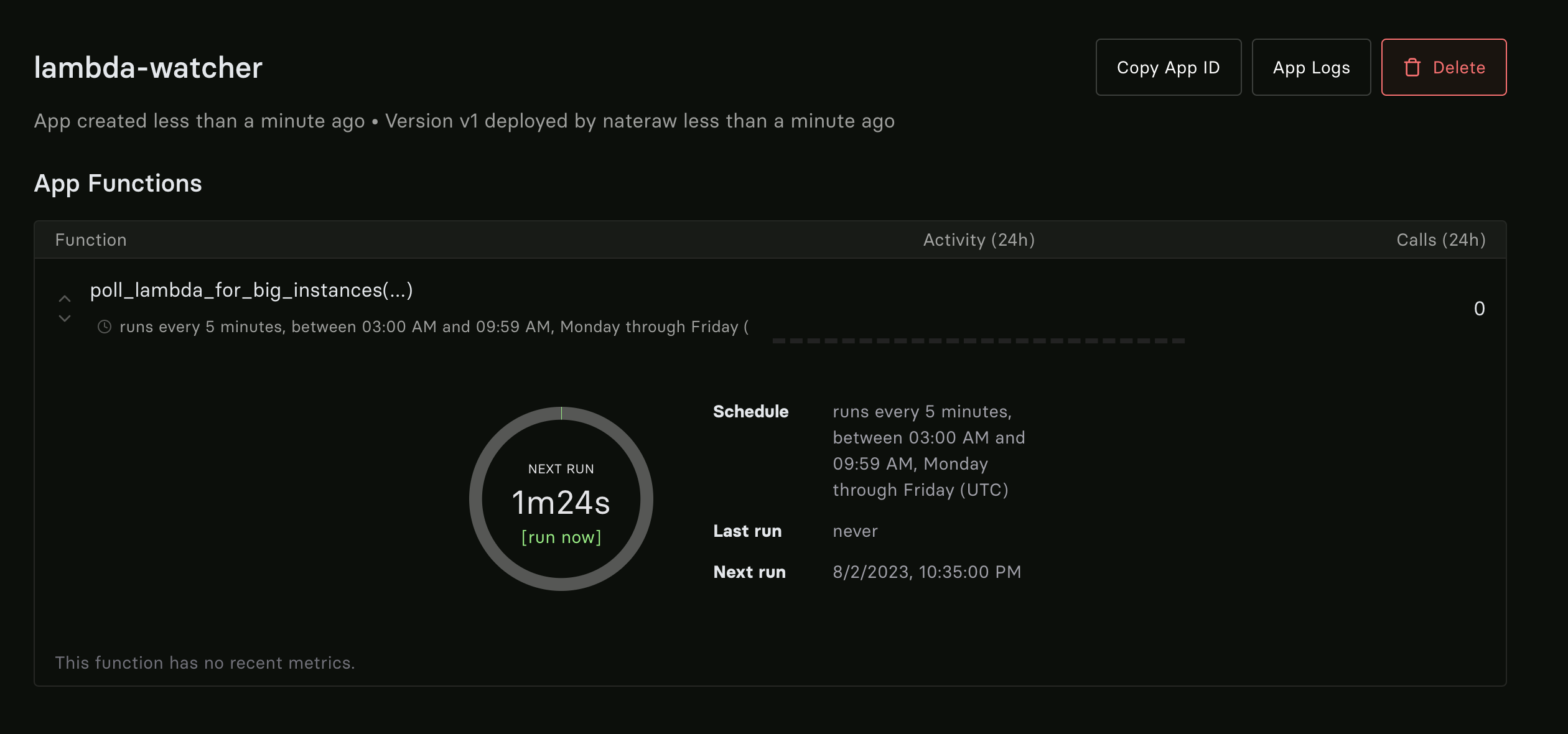 modal.runner.deploy_stub(stub, name="lambda-watcher")If all went well, you should get a text message when an instance becomes available. You can also check the logs in Modal to see what’s going on. In the UI, you should see something like this for the deployment: